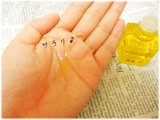 | テクスチャーはサラリとして、伸びも良く、ニオイなども気になりません。 オイル独特のベタつきもなくとても使いやすそう! 容器はプラスチックなので、たっぷり出したい時はギュッと押して適量を出すことができます。 瓶タイプだとこうはいかず、何度も何度も振って出さないといけないので、これは好印象♪ |